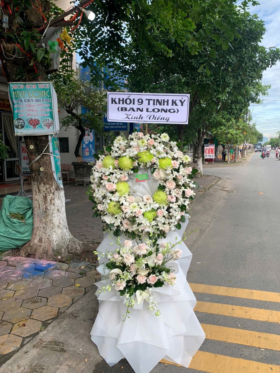 Kệ hoa chia buồn với tông màu trang nhã, thiết kế trang trọng, thay lời tiễn biệt sâu sắc và trân trọng.