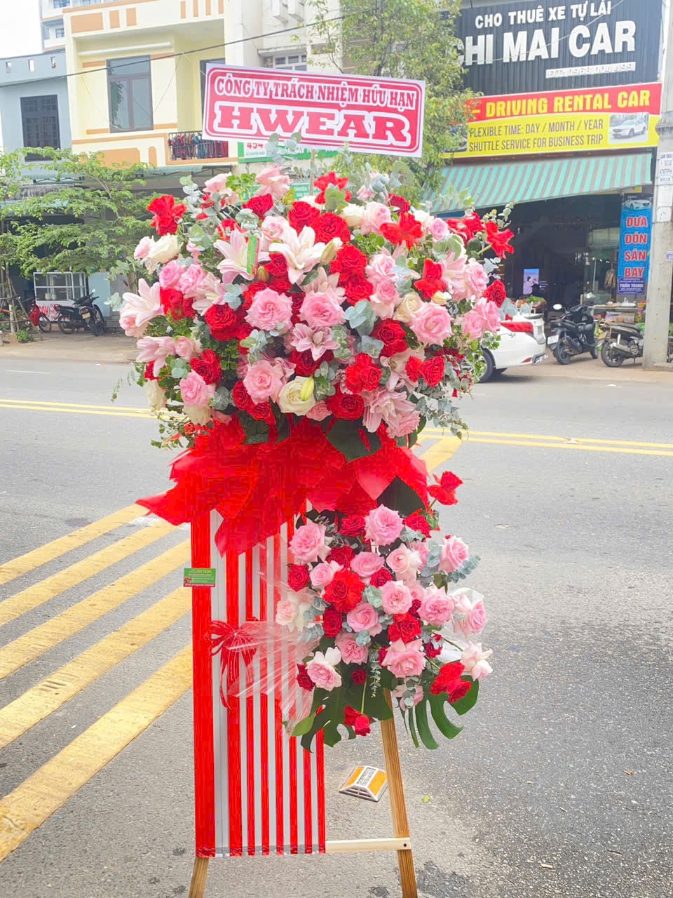 Kệ hoa chúc mừng được thiết kế hoành tráng, sắc màu rực rỡ, phù hợp tặng đối tác, người thân trong dịp khai trương, lễ lớn.